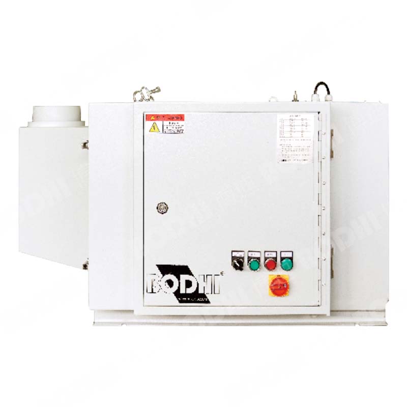 博迪联合系列采用静电除油烟尘技术。含油烟、雾尘的污染气体通过进风口进入吸雾器腔内,铝合金丝网拦截大颗粒粉尘,剩余的烟气尘流经电离子发生器被带上负电,然后带有荷电的烟雾和气雾颗粒被集尘组件捕获,干净气体经风机排放到车间。