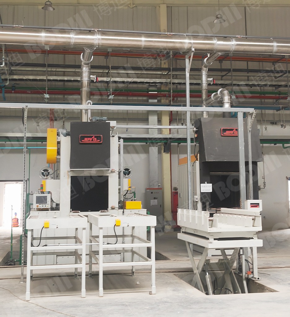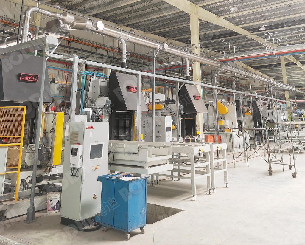 解决方案:通过对用户现场工况的勘察,博迪为用户定制了个性化的油烟捕集与治理解决方案。多用炉、转底炉生产线共用一套热处理专用油烟净化系统(包括: 油烟净化器、排放管道、控制系统等),处理可控气氛热处理工艺过程中所排出的废气,这些废气包括:油烟、碳黑颗粒物、含碳黑颗粒物燃烧废气、含水蒸汽的油烟挥发物等。推荐使用HCY-1200WF文丘里水式过滤主机,既保证设备运行的安全,又能满足过滤后的排放要求。并且在管道入口处增加一套管道喷淋系统,用以降低温度隔绝火源,且具有预过滤作用。为节约能耗,在回火炉罩口增加自动风阀,与回火炉联动,当回火炉门打开时自动风阀打开,并控制风机变频提高风量。废气进入除尘器后经离心分离和湿式分离,室外15m高空排放,所有废气经收集净化处理后符合国家排放标准。